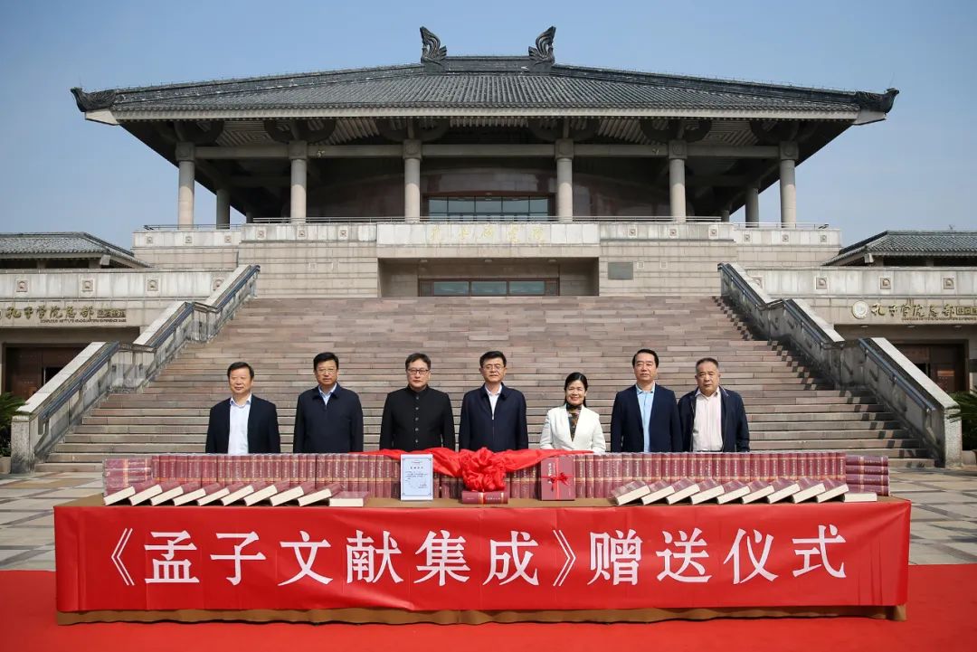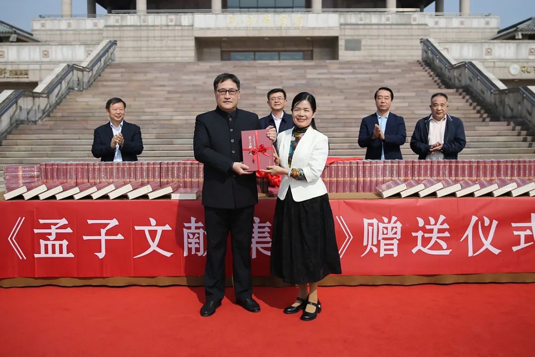 10月11日,《孟子文獻(xiàn)集成》贈(zèng)送儀式在孔子研究院辟雍廣場(chǎng)舉行。尼山世界儒學(xué)中心副主任、孔子研究院黨委書記朱瑞顯,孔子研究院副院長(zhǎng)劉續(xù)兵、袁汝旭,紀(jì)委書記張新杰和孟子研究院黨委書記、院長(zhǎng)陳曉霞,副院長(zhǎng)趙龍、毛景衛(wèi)參加贈(zèng)書儀式。