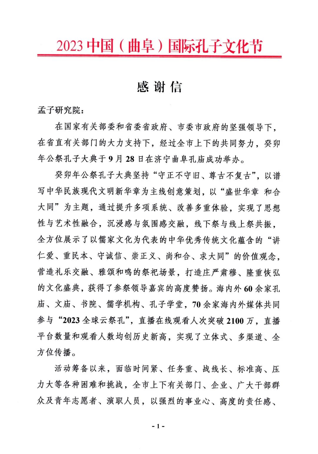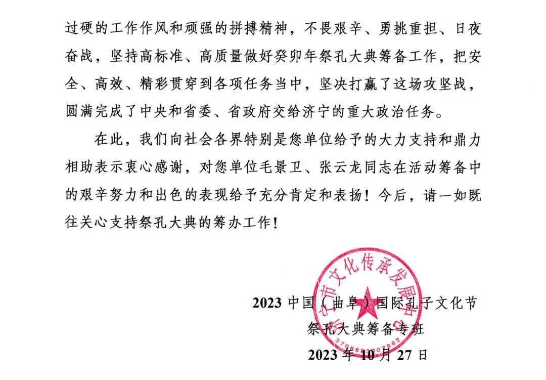 孟子研究院收到2023中國(曲阜)國際孔子文化節祭孔大典籌備專班感謝信