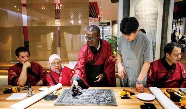外國(guó)友人在孔子學(xué)院總部體驗(yàn)基地感受中華優(yōu)秀傳統(tǒng)文化。(央廣網(wǎng)發(fā) 濟(jì)寧市網(wǎng)信辦供圖)
